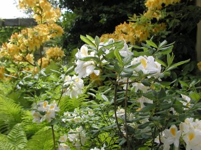 Nach dem Durchschreiten des Tores - blühende Azaleen an der Hauswand.